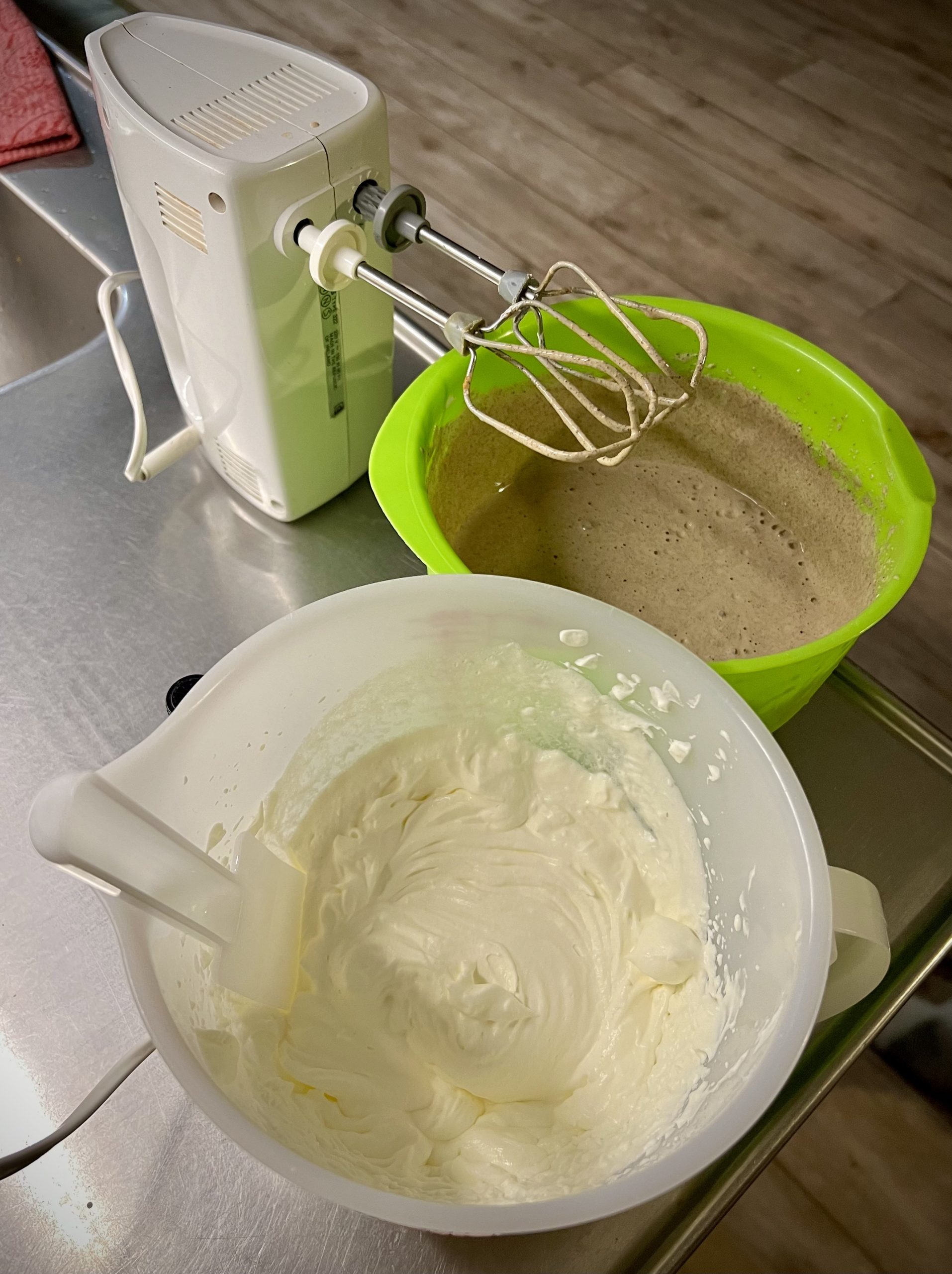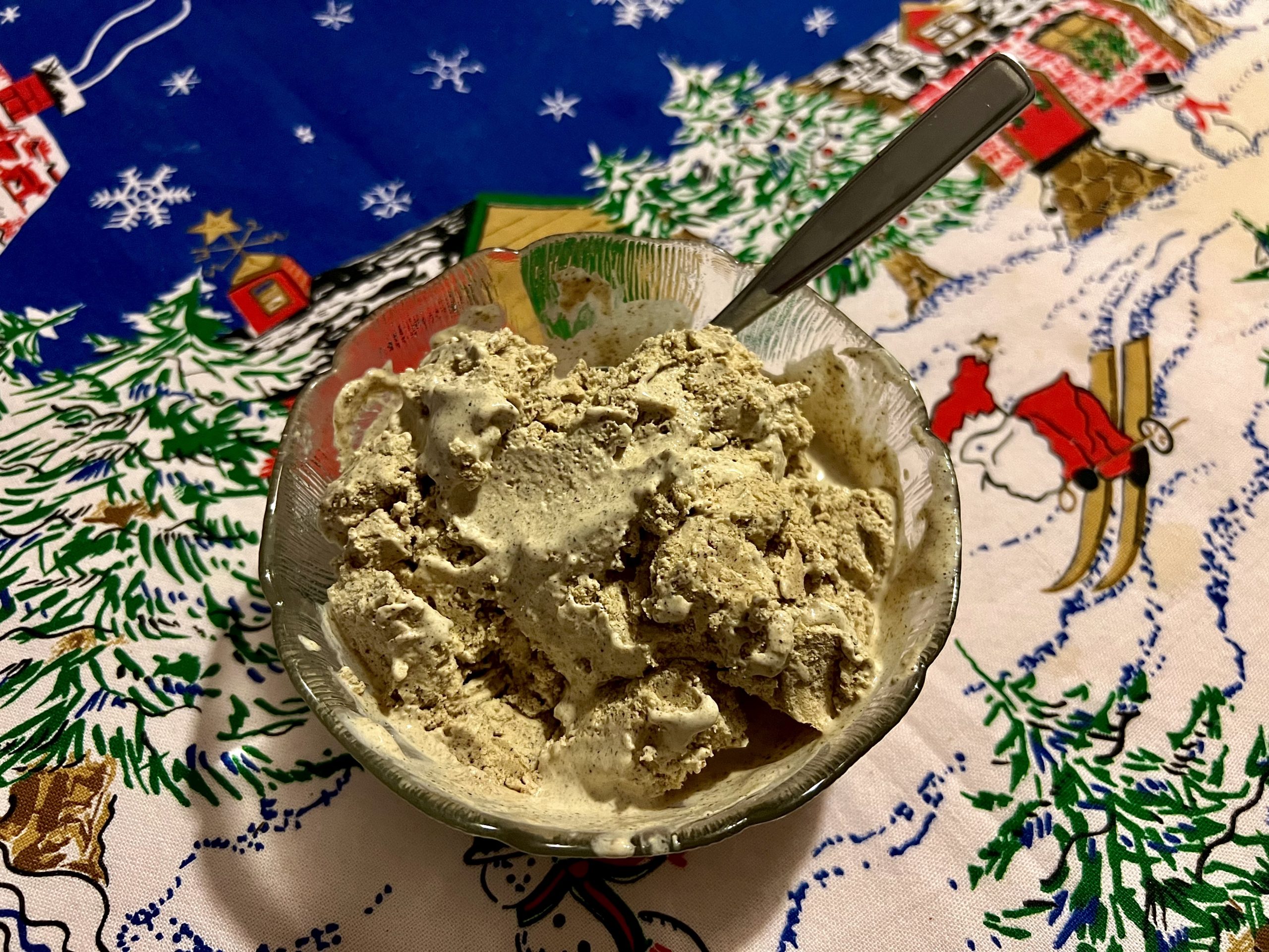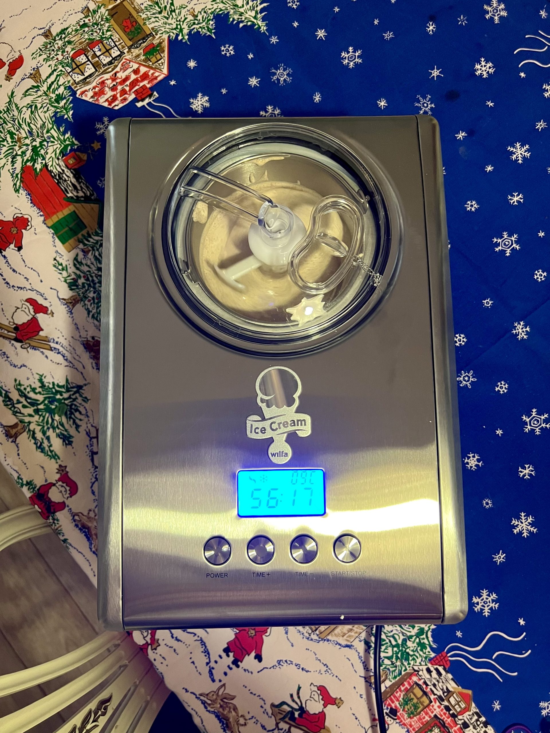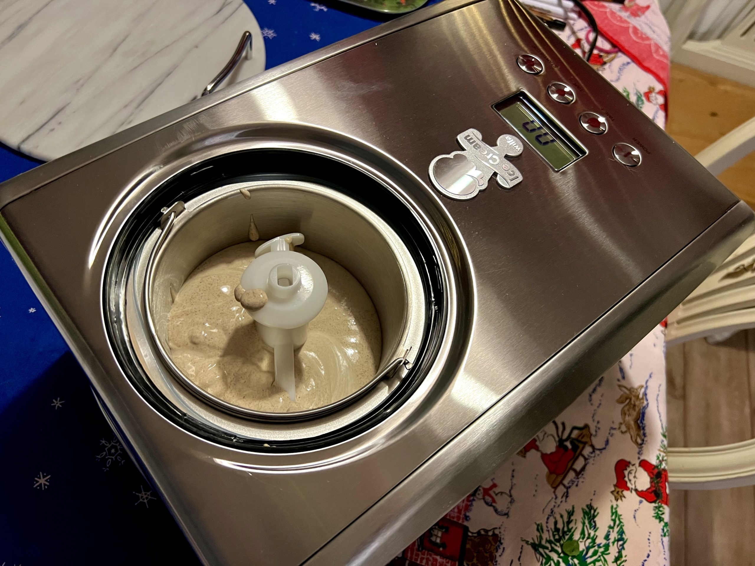 Så åter till glassen och hur jag gjorde den. Jag vispade grädden lätt ihop med steviadroppar. Så vispade jag ihop resten av ingredienserna i en annan bunke. När det var klart vände jag ner grädden i ”pepparkakssmeten” och hällde alltsammans i glassmaskinen. Den har en inbyggd kompressor för kylning, så man behöver inte förfrysa någon glassbunke.